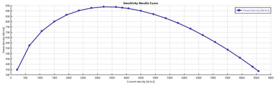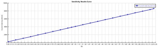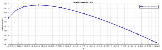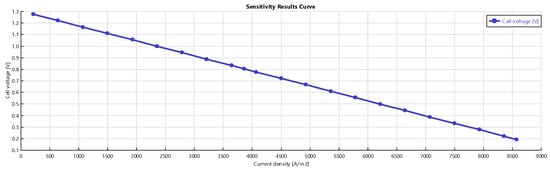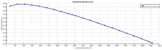 Figure 6, Figure 7 and Figure 8 show the effects of varying the current density on the system. Increasing decreases the voltage and electrical efficiency but increases power until a peak, then power decreases. The descending trend of the cell voltage shown in Figure 6 is due to higher voltage losses (ohmic, activation, and concentration). The reduction of the electrical efficiency with the current density is shown in Figure 8. The trends obtained from the sensitivity analysis are in good agreement with literature ones [21,22].