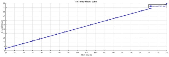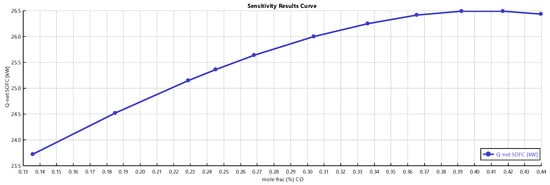 A sensitivity analysis on the SOFC power production, varying the inlet air and the mole fraction of CO inlet to the ANODE block, was carried out. As shown in Figure 9, increasing the concentration of CO allows an increase of the SOFC power (Q-net SOFC, in the y-axis) produced. In fact, more CO favors the water–gas shift reaction, which is an exothermic one. This means that the cell requires less heat duty and can give more.