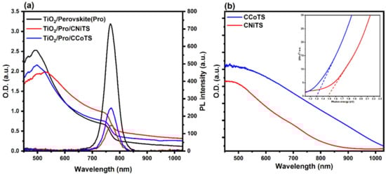 (a) UV-Vis absorption and steady photoluminescence (PL) spectra of the FTO/C-TiO2/M-TiO2/Perovskite/CMTS film stacks, and (b) UV-vis absorption spectra and the Tauc plot (inset) of CM(M = Ni, Co)TS films. Abbreviations: CMTS: Cu2M(M = Ni, Co)SnS4; FTO: Fluorine-doped tin oxide.