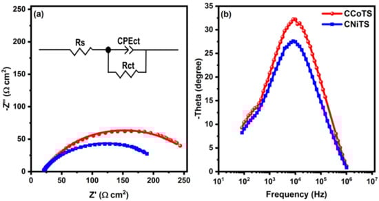 The semicircles in Figure 3a can thus be attributed to Rct at the perovskite/HTM interface and the diameter of the arc gives the value for Rct [23,27], which is 211 Ω cm2 for CNiTS and 264 Ω cm2 for CCoTS (see Table 1). The smaller Rct of the CNiTS device implies faster charge transport at the perovskite/HTM interface, which is in agreement with the more pronounced quenching of the PL for CNiTS as compared to CCoTS (see Figure 2a).