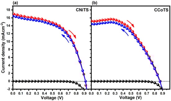 Record current density-voltage (J-V) curves for the (a) CNiTS and (b) CCoTS-based PSCs, in forward and backward directions with a 50 mVs−1 scan rate, under 100 mWcm−2 AM 1.5 G illumination and in the dark.