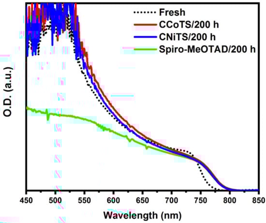UV-Vis absorption spectra of perovskite-coated CCoTS, CNiTS and spiro-MeOTAD after 200 h of light soaking under AM 1.5 simulated solar light in ambient air (50% relative humidity).