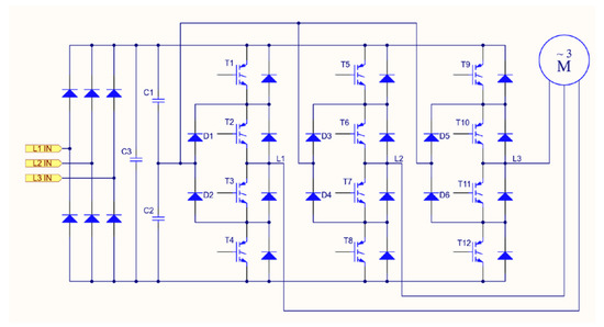 The main circuit of the prototype three-level neutral point clamped (3L-NPC) inverter. T1–T12 are the IGBT transistors, D1–D6 are the neutral point clamping diodes, C1–C3 are the filtering capacitors, L1–L3 are input and output of the inverter, and M is the 3-phase squirrel cage induction motor.