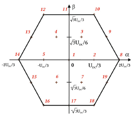 Nineteen-output phase-to-phase voltage vectors can be represented in complex αβ space, which is used to implement a space vector modulation [9,13]. The representation of all output phase-to-phase voltages of 3L-NPC is presented in Figure 2. This gives 19 possible switching vectors used to synthesize the rotating U0 vector. U0 is a reference voltage vector and represents a rotating magnetic field. U0 is approximated as a weighted average combination of three adjacent switching voltage vectors [9,13,14].