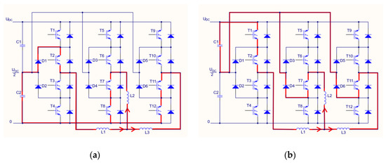 An example of the current flow in the 3L-NPC inverter for the space vector number 2 (Figure 2): (a) a redundant vector which draws the current from C2; (b) a redundant vector which draws the current from C1.