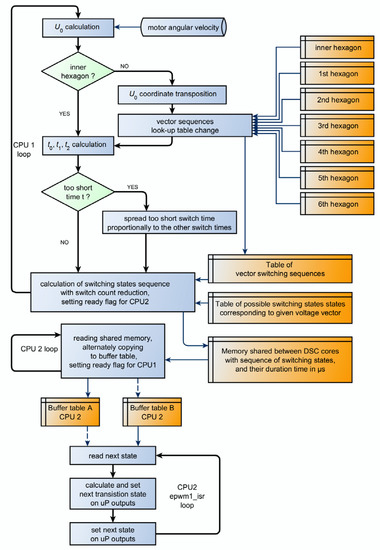 - The second core is used to set twelve PWM outputs with 1μs temporal resolution, according to the calculated switching times and sequence, with consideration of dead-band time. Six ePWM DSC modules with twelve high resolution outputs, ePWM1 to ePWM6, are synchronized together. The PWM output state is forced through the software control at the end of each 1μs PWM period. Every one microsecond epwm1_isr interrupt function is called to set outputs in line with the two n × 2 integer array computed by the first core. The array is sent alternately to two data tables of the second core, through shared RAM. Two data tables are used to avoid data starvation. The alternate calculated SVM data flow is depicted in Figure 4 by dashed and solid lines.