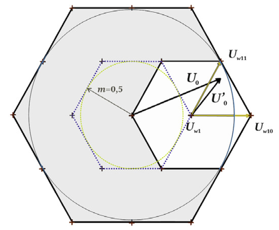 After the transposition of U0 to U’0, the table of the voltage vector sequence which corresponds to the chosen outer hexagon is set. In the case shown in Figure 6, U’0 is in the first sector of the first outer hexagon and the sequence of vectors is: Uw1, Uw10, Uw11, Uw1, Uw11, Uw10, and Uw1 (the first row in Table A3).