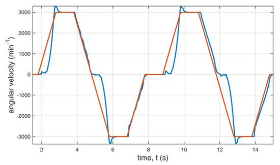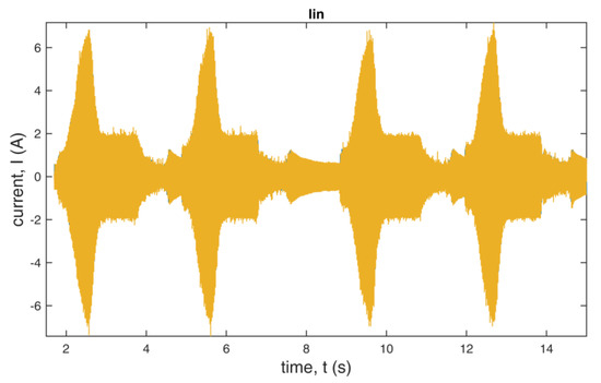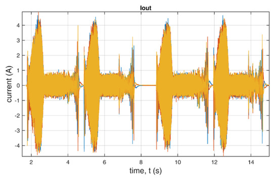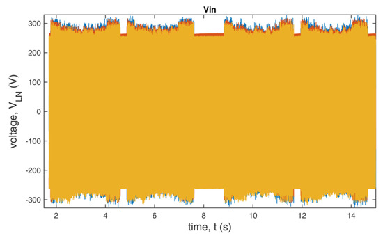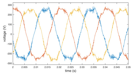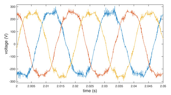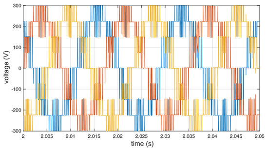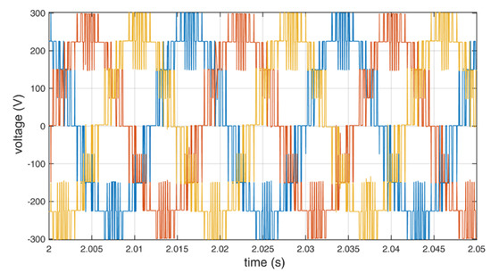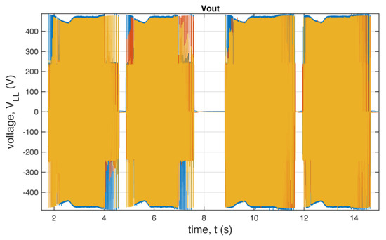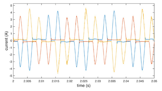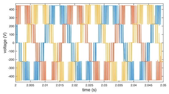 The SVM parameters were described in Section 2.4. For the measurements, we chose delta connection. The voltage on the filtering capacitor UDC was set to 480 V. The motor was loaded with a 1.02 Nm torque during the steady state tests. The angular velocity measurement is taken every 20 ms. The PI regulator was implemented with the following coefficients: Kp = 0.3413, Ki = 12.4562. The coefficients were obtained with the Cohen–Coon tuning method. The goal of the regulator was to maintain the angular velocity of the motor at 3000 rpm for 10 s per measurement. The V/f control is used. Measurements are shown in Figure 8, Figure 9, Figure 10, Figure 11, Figure 12, Figure 13, Figure 14, Figure 15, Figure 16, Figure 17, Figure 18, Figure 19, Figure 20 and Figure 21. The figures show voltages and currents from t = 2 to 2.05 s.