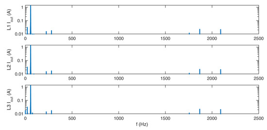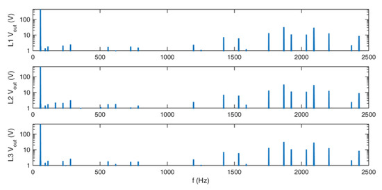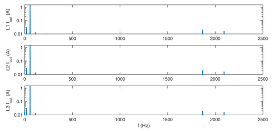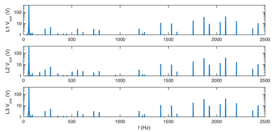 Figure 14, Figure 15, Figure 16 and Figure 17 show the frequency spectra of the output voltages and currents. The main peak on those figures is the first harmonic. Around 2 kHz, harmonics of the chosen sampling frequency TC can be seen, which are the characteristics of the SVM. The THD is relatively low in both cases, with and without the use of additional redundant switching vectors, as shown in Table 4.