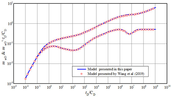 The proposed composite model can be simplified to one region (when M21 = 1) dual medium model without considering threshold pressure gradient and stress sensitivity (when γmD = 0 and λmD = 0). Comparison of log-log transient pseudo-pressure curves between simplified model in this paper and the model of Wang et al. is shown in Figure 2. There is a great agreement both for pseudo-pressure curves and derivative curves, which indicates that the simplified model is valid.