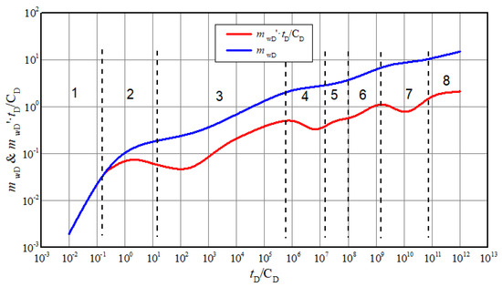 Based on a mathematical model and solving method, the response of wellbore pseudo-pressure and its derivative over time is obtained and drawn in log-log coordinate system as shown in Figure 3. It can be observed that the flow of gas can be divided into eight flow regimes.