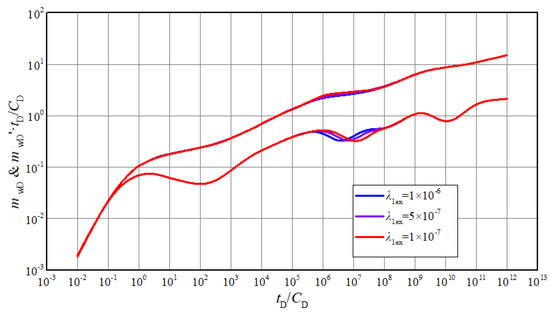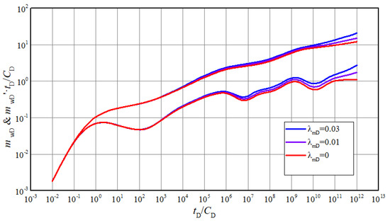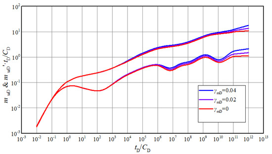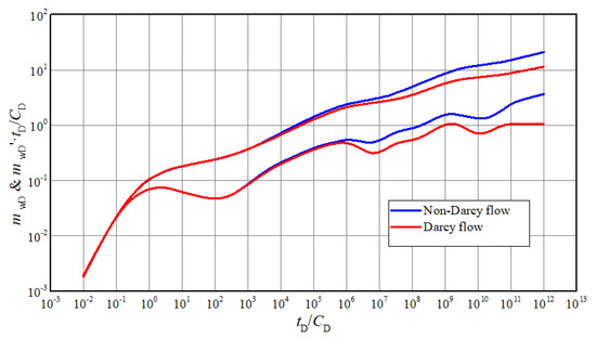 For low-permeability gas reservoir, both threshold pressure gradient and stress sensitivity will result in non-Darcy flow. As shown in Figure 6, the blue curves are pressure responses considering the combination of threshold pressure gradient and stress sensitivity, marked as non-Darcy flow. In contrast, these effects are not taken into account for red curves. The values of other parameters are the same as above, except threshold pressure gradient and permeability modulus ( for non-Darcy flow and for Darcy flow). It could be found that the typical curves of Darcy flow are lower than non-Darcy flow. The red pseudo-pressure derivative curve is almost a horizontal line in stage 8, meaning that it is radial flow. So, it is a typical characteristic to determine whether there is a non-Darcy phenomenon.