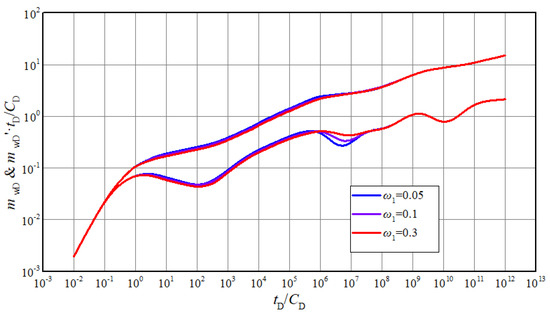 Figure 8 and Figure 9 show the effects of inter-porosity flow coefficient and storability ratio on curves, respectively. The two parameters mainly influence the curves characteristics of the 4th stage. The dip appears earlier with the increasing of inter-porosity flow coefficient. The positions of pseudo-pressure and derivative curves lower and the dips become deeper with the decreasing of storability ratio. Similar to inner region, the two parameters of outer region will have the same function on curves in 7th stage. In actual interpretation, the depth of dip in the measured curves can be used to identify storage capacity of matrix and fractures. The occurrence time of dip in measured curves can be used to identify the ability of inter-porosity flow.