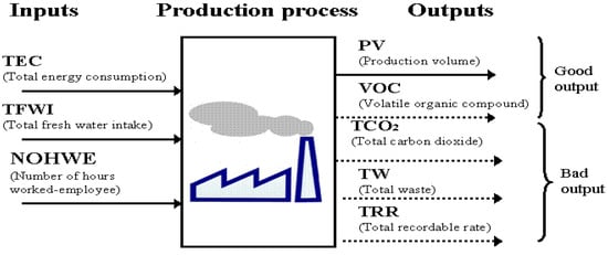 Data envelopment analysis (DEA) is a mathematical programming approach used to measure productive efficiency, based on the idea of the production frontier in micro-economics. The two basic radial-DEA models, introduced by Charnes, Cooper, and Rhodes (CCR) and Banker, Charnes, and Cooper (BCC), define the input excess and output shortfall as inefficiencies. Zhou et al. (2008a) surveyed the application of DEA in 100 energy and environment studies and found that efficiency could be effectively measured using the radial methods of the CCR and BCC models [12]. The value-added process of manufacturing companies encompasses both desirable and undesirable outputs. We therefore used the DEA bad-output model to evaluate the sustainability performance of a manufacturing company, in which input and bad-output factors, the natural environment, and laborers’ health, and safety were included. In addition to the theoretical model, this study presents an application for a global chemical manufacturing company to implement sustainability benchmarking in its production factories.