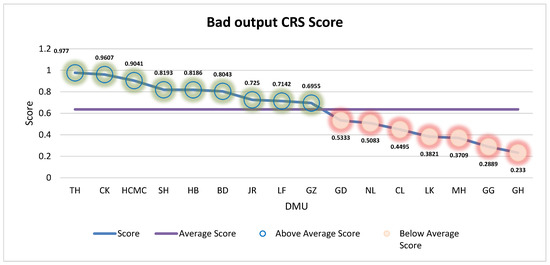 Table 3 gives the average efficiency values of the 16 locations. The mean value using VRS (0.8260) was 29.76% higher than when using CRS (0.6365). In the previously mentioned review of over 100 papers, almost 50% applied CRS to DEA for environment- and energy-related research. If we had used VRS in the DEA, the value would have required significant estimation [68], so we applied CRS in the DEA bad-output model to obtain the efficiency values of the 16 locations.