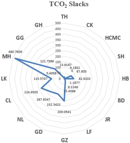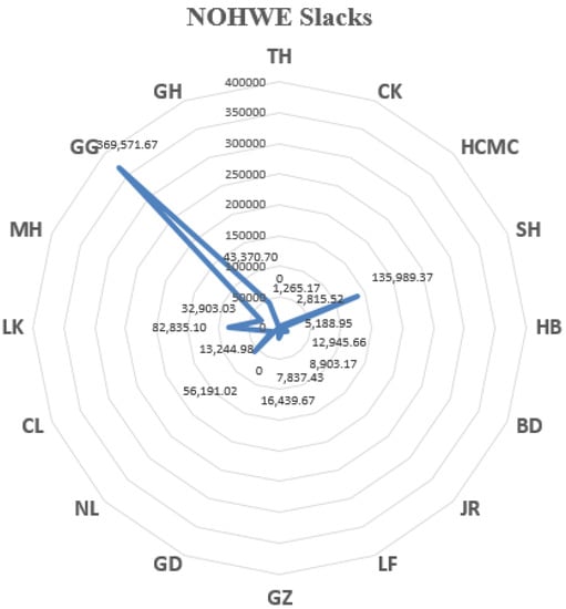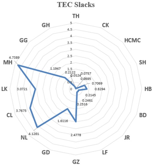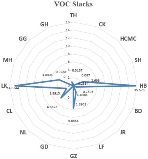 First place: The factory TH located in India achieved the highest efficiency score (0.977). For NOHWE and TRR, it scored zero slacks. The slacks for TEC, TFWI, and TW were the lowest of the 16 locations and could thus be used as a benchmark. However, TH could still improve its performance in TCO2 and VOC by benchmarking; HCMC in Vietnam showed the best performance on these variables, with zero slacks for both.