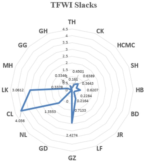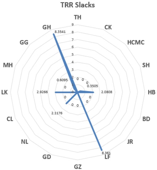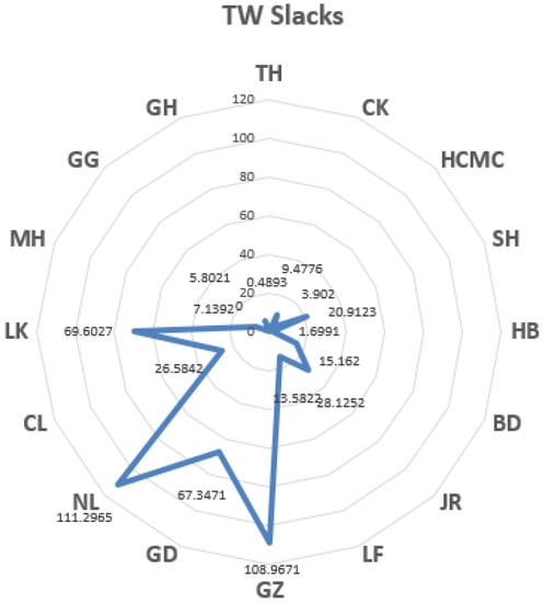 Eighth place: The LF factory in China achieved the eighth highest efficiency score (0.7142). The slacks for most inputs and outputs were at the average level of the 16 locations. This location had the worst slacks score for TRR, which could be improved. This location could derive benchmarks from other locations that performed well in this area (i.e., TH, CK, HCMC, BD, JR, GZ, CL, and MH).