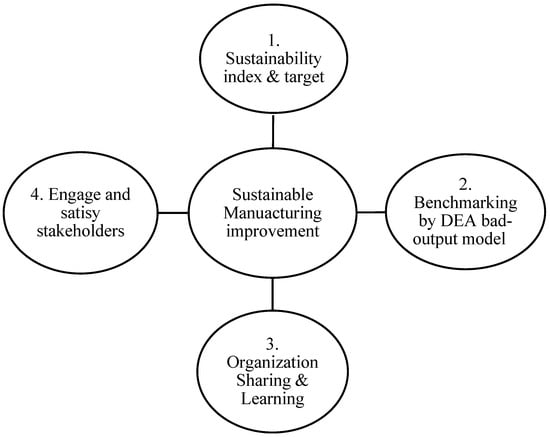 The contributions of Sustainable Manufacturing improvement summarized as the following Figure 10. The criteria for benchmarking shall have the definition, target, scope, and object that can collect the baseline for measurement. The case applied DEA bad-output model that can minimize resource input and undesirable output by maximizing the good output. Therefore, the DMU ranked at the top for each input or bad-output is the benchmark for other DMUs in the organization or network, which can engage and satisfy employees or customers for sustainable continuous improvement on eco- friendliness or mitigate the environmental impact while pursuing manufacturing excellence.