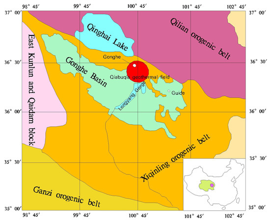 Located in the east of Gonghe Basin in Northwest China, the Qiabuqia geothermal field is one of the three identified geothermal fields in Gonghe Basin. The total area of geothermal field is more than 790 km2, and the area of the Qiabuqia geothermal field is 246.9 km2 [20], as shown in Figure 1.