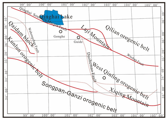 Gonghe Basin is located in the junction area of East Kunlun, West Qinling, and South Qilian. Its tectonic location is special, and its tectonic evolution has the characteristics of “two periods and five stages”: trigeminal rift structure in Early Paleozoic, rift dynamic background transformation in Late Paleozoic, continuous collision in early Middle Triassic, collisional orogeny in Late Triassic, and mountain formation of Nanshan uplift in Pliocene. Finally, Nanshan uplifted rapidly and the United basin was decomposed into two independent basin units, Qinghai Lake fault basin and Gonghe fault basin, forming the present tectonic framework [22], as shown in Figure 2.