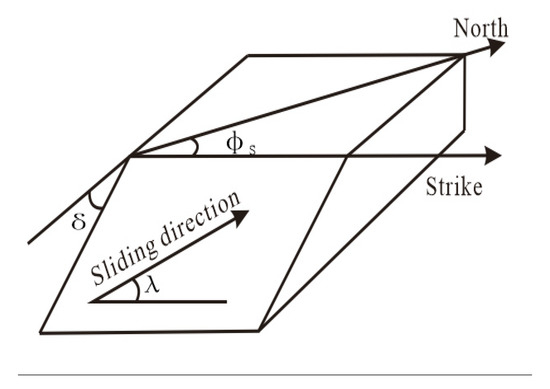 Seismic faults are usually described by three parameters: strike φS, dip angle δ, and slip angle λ. Strike φS: direction of intersecting plane with horizontal plane. Direction determination: along the strike, the hanging wall of the fault is on the right. The strike direction is represented by the angle from the north clockwise needle amount to the strike direction, with 0° ≤ φS < 360°. Dip angle δ: the angle between fault plane and horizontal plane, with 0° < δ ≤ 90°. Slip angle λ: measured on the fault plane, the angle from anticlockwise direction to slip direction is positive, and the angle from clockwise needle to slip direction is negative. The slip direction refers to the movement direction of hanging wall relative to footwall, with −180° < λ ≤ 180°. Strike φS and dip angle δ are the geometric parameters of faults, which determine the occurrence of faults; the slip angle λ is the motion parameter of faults, from which all kinds of motion types of faults can be described, as shown in Figure 4 and Figure 5.