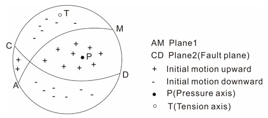 According to the point source double couple mode, the initial motion direction of the far-field displacement can be calculated as a regular quadrant distribution. The distribution of the initial motion direction on the projection plane of the source sphere can be obtained from the station records in different directions relative to the source, and the positions of the principal stress axis and 2 nodal planes are given, as shown in Figure 6.