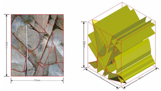 For rocks with less weathering and erosion, most of the joints and fissures are produced by the tectonic action of the in-situ stress field [28]. These fissures constitute the dominant fissures of the rock mass joint fissures, which have strong statistical laws. The rest of the fractures are mainly produced by weathering erosion or diagenesis. These fissures are usually disordered and have no statistical rules. Through the reconstruction of three-dimensional fractures, we find that most of the joints and fissures are straight and run through each other, which are typical conjugate shear joints.
