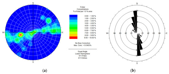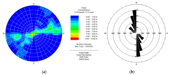 Statistical results of joints and fissures in granite. (a) Iso-density map; (b) Rose diagram of joint strike.