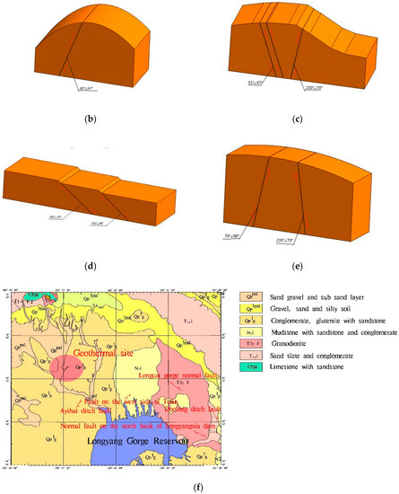 Investigation area fault model. (a) Ayihai ditch fault; (b) Longcai gorge normal fault; (c) normal fault on the north bank of Longyangxia dam; (d) fault on the west side of Tulin; (e) Duolong ditch fault; (f) positions of small faults.