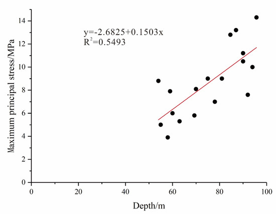 Firstly, we investigated the in-situ stress of some shallow sites. According to the survey results, in the depth of 30–60 m, except that the main stress value of No.1 measuring point is in the southwest direction, the stress values of the other four measuring points are in the northeast direction, about 55 degrees. Except point 1, the dip angle is below 25 degrees. The dip angle of No.1 point is 32 degrees, and the data are abnormal, which may be because it is just near the fault zone. To sum up, the shallow in-situ stress is mainly distributed in the NE direction within 60 m, N in 60–80 m, and NW in 80–100 m. According to the measured data, Figure 12 is obtained through regression analysis. According to the regression analysis curve, R2 is 0.5493, the correlation is medium, so regression analysis can be carried out.