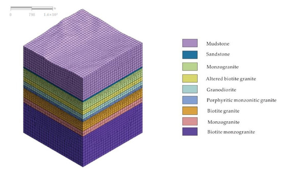 Since there is only one well in this area, the established strata are all horizontal except surface layer. The model is set to 3000 m × 3000 m × 4000 m, and the analysis area is large enough to eliminate the abnormal stress field caused by the boundary conditions imposed on the central target well area, and improve the reliability of the results. Different from the traditional cube model, the physical geological model considers the influence of surface topography, mountain unloading and other factors on in-situ stress, in order to make the results closer to the reality. The in-situ stress in the shallow part was inverted by regression analysis, so that the calculated stress field and the measured stress field can achieve the optimal fitting. There is no in-situ stress data measured in the deep, so the boundary method is used for inversion in combination with the regional overall in-situ stress and the in-situ stress direction of the small area. The drilling and production direction is set as Z direction, and the horizontal plane is XY plane to use the boundary stress method to impose boundary conditions. The establishment model is shown in Figure 13.