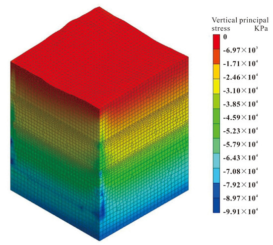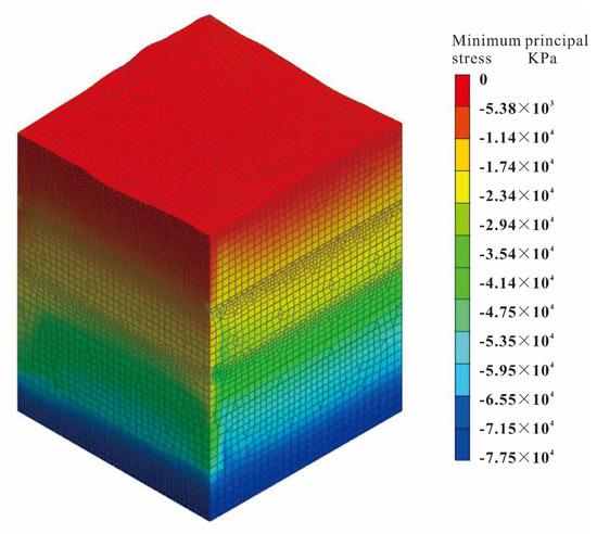 The software simulation results are shown in Figure 14, Figure 15 and Figure 16. According to the analysis results, the principal stress values are increasing from shallow to deep, and the overall change is uniform. Based on the analysis of the software calculation results, the variation trend of ground stress is shown in Figure 17. At the depth of 3500 m, the maximum principal stress reaches 82 MPa and the stress gradient is about 0.0234 MPa/m; the minimum principal stress reaches 45 MPa, and the stress gradient is about 0.0141 MPa/m; the intermediate principal stress reaches 70 MPa, and the stress gradient is about 0.02 MPa/m.