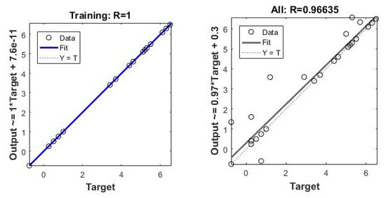 There are only 20 sets of seismic parameters in Table 5, including 13 earthquakes with Ms ≥ 5.0 and 7 induced earthquakes occurred in typical geothermal sites. All 98 sets of data are substituted into the ANN model for simulation training, and the data are preprocessed before the parameters are input, that is, the injection volume, the distance from the fault, the depth, the magnitude of in-situ stress, and the orientation of in-situ stress are represented by logarithm, which can improve the accuracy of the model. The effect of model training is shown in Figure 19.