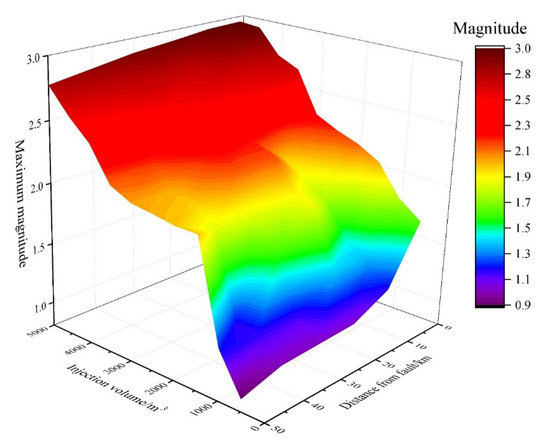 Surface plot of maximum magnitude with variable injection volume and distance from fault.