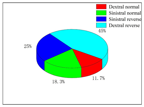 In this neural network model, there are five variables and two output values. In the Qiabuqia geothermal field, the drilling depth is 3500 m, so the value of in-situ stress is 82 MPa and the orientation of in-situ stress is NE 37°. The maximum earthquake magnitude caused by hydraulic fracturing is predicted by changing the volume of injected water and the distance from fault. The magnitude increases with the increase of injection volume, as shown in Figure 20. When the injection volume reaches 5000 m3, the maximum magnitude is close to magnitude 3. At the same time, with the decrease of the distance from the fault, the magnitude of seismicity also increases slowly, but not obviously. When the injection volume is small, the phenomenon that the magnitude increases with the decrease of distance is difficult to detect. However, when the injection volume is large, such as more than 3500 m3, this phenomenon becomes obvious gradually. In addition, most of the focal mechanism of induced earthquakes are reverse faults, accounting for 70%, of which 25% are sinistral reverse and 45% are dextral reverse, as shown in Figure 21. Normal faults account for only 30%, including 18.3% sinistral normal and 11.7% dextral normal.
