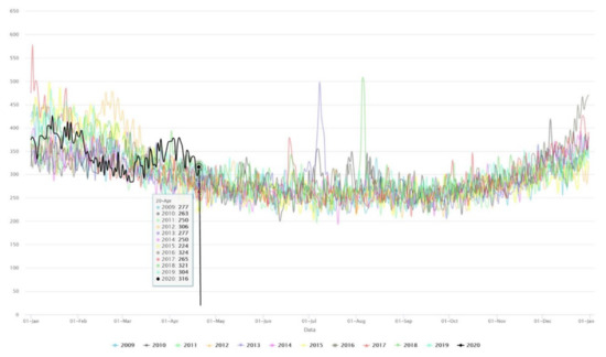 Daily mortality in Portugal from 2009 to April 2020 [6].