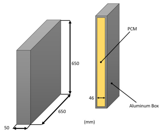 For this proof-of-concept study, a mass limit value of around 20 kg per device was considered. Given the mass specifications, the selection of PCM device shell (box) material led to the choice of a lightweight but resistant material with a high thermal conductivity: an aluminum sheet with a thickness of 2 mm was selected as the box material.