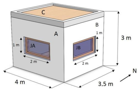 In order to assess the expectable order of magnitude of the effect of the device in the indoor temperature, a reference room realistically representative of a room in a real building was considered. Figure 3 shows a schematic representation of the reference room with the respective dimensions. The reference compartment is a small room with 14 m2 of floor area and 2.7 m in height, with two exterior walls facing south and east, both with a 2 m2 window, a horizontal roof terrace, two interior walls and interior floor. There is also a 2 m2 door in the interior wall (D). It is considered that the adjacent rooms have similar thermal behavior. These characteristics, especially those related to the solar orientation and aperture, imply that the room is prone to some overheating—therefore among those that are the primary target of the system being developed.