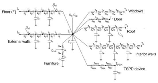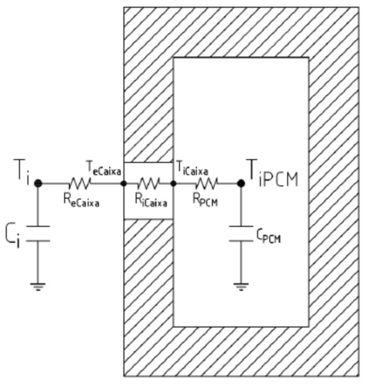 RC circuit representing the heat transfer inside the device and between the device and the room air. Ti represents the room air temperature; TiPCM is the PCM temperature [24].