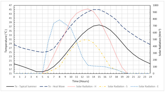 Temperature and solar radiation (Horizontal, South, and East) hourly profiles considered in the typical summer and in the heat wave conditions/scenarios.