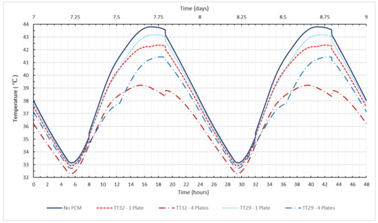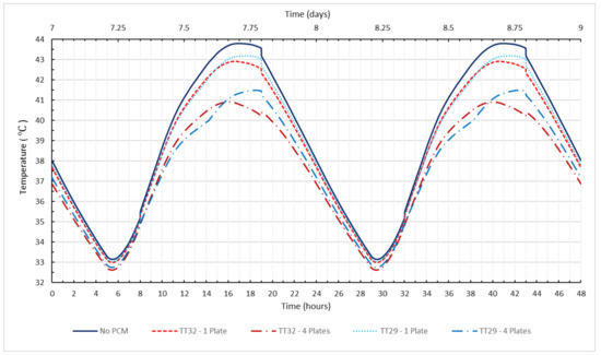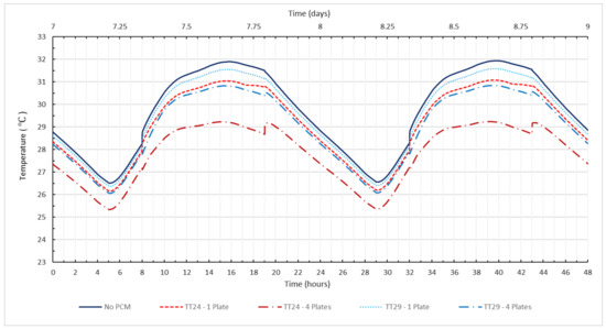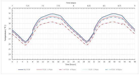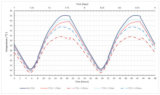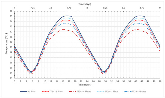 Figure 11 and Figure 12 show the indoor temperatures for 2 days in different building inertia and device alternatives, for the case with forced convection at the place surfaces. With one PoDIT module (1 plate), the observed peak temperature attenuation is about 1.1 °C for the low inertia room, and about 0.9 °C for the high inertia room. If four modules are used, then the peak temperature attenuation becomes slightly above 4 °C in the low thermal inertia building and close to 3 °C in the high thermal inertia room. Table 5 summarizes the impact of the device in the indoor temperature, showing reductions vs the “no device case” for the maximum room air temperature and for the room air temperature at 2 AM.