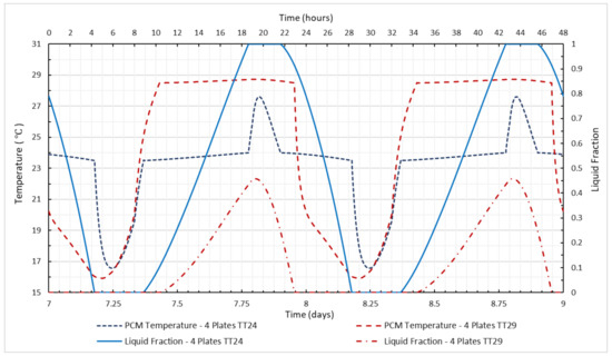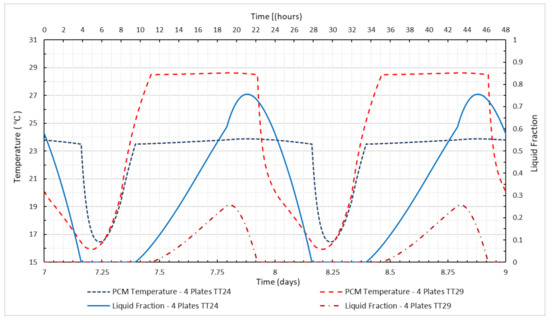 In order to overcome the shortcoming illustrated in Figure 9 (PCM never becoming fully liquid), it was decided to consider a design variant with a fan blowing air at 5 m/s through the external surfaces of the device, triggering forced convection and thus intensifying the heat transfer to and from the PCM. Figure 10 shows the results of the PCM and its liquid fraction with these new conditions. They clearly show that in this circumstance the PCM transition temperature of 24 °C does become fully liquid, thus making full use of its thermal storage capability. The PCM with a transition temperature of 29 °C improves considerably compared to Figure 9, but still does not become fully liquid.