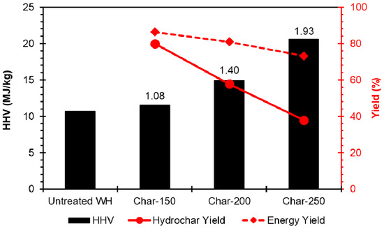 Untreated water hyacinth (WH) and hydrochar characteristics, including HHV (black bars), hydrochar yield (red circles), and energy yield (red diamonds). The numbers above the bars represent the energy densification of the hydrochar compared to the untreated WH. HHV is reported on a dry basis. Char-150 = WH hydrochar produced at 150 °C. Char-200 = WH hydrochar produced at 200 °C. Char-250 = WH hydrochar produced at 250 °C.
