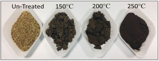 Figure 1 shows the HHV of the untreated WH was 10.7 MJ/kg. WH is typically an unsuitable feedstock for direct combustion, due to its low calorific value, high inorganic content, and high moisture content. HTC is often considered to simulate the natural coalification process [67]; generating an energy densified solid, hydrochar [19]. The HHV of all hydrochars was higher than the untreated WH and increased with increasing HTC temperature. The HHV of Char-150, Char-200, and Char-250 was 11.5 MJ/kg, 14.9 MJ/kg, and 20.6 MJ/kg, respectively. This corresponds to an energy densification of 1.08, 1.40, and 1.93, respectively. Figure 2 displays the changing appearances of the hydrochars under the different HTC conditions. A darker, more coal-like hydrochar was observed at HTC temperature increased. In a related study, WH hydrochar produced at 232 °C had a HHV of 21.2–21.8 MJ/kg [23], similar to Char-250, shown in this study. This increase in HHV is due to the increase in the carbon content; including fixed carbon and a reduction in the oxygen content of the hydrochars; Table 2. Hydrochar yield is widely reported to decrease with increasing HTC temperature across a range of biomass types [29,38,41,65,68,69], typically in a sigmoidal fashion [69]. Figure 1 shows hydrochar yield of Char-150, Char-200, and Char-250 was 79.9%, 57.8%, and 37.8%, respectively. Zhang et al. [22] found HTC of WH at 180 °C, 210 °C, 240 °C, and 270 °C gave hydrochar yields of 47.9%, 48.0%, 33.1%, and 28.8%; slightly lower than found in this study; highlighting differences between different samples of WH. The reduction in hydrochar yield with increased HTC temperature means the energy yield also decreases with increasing HTC temperature. Figure 1 shows the energy yield from the hydrochars was 86.3%, 80.9%, and 73.2% for Char-150, Char-200, and Char-250 respectively. Therefore, despite the greater energy densification that occurs at higher HTC temperatures, the reduced hydrochar yield causes a reduction in the overall energy yield.