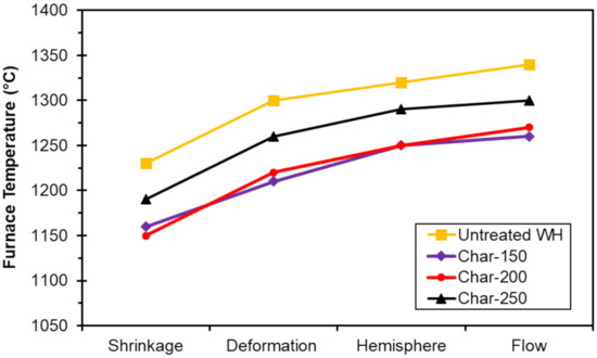 Ash fusion transition temperatures for untreated water hyacinth (WH) and water hyacinth hydrochars). Char-150 = WH hydrochar produced at 150 °C. Char-200 = WH hydrochar produced at 200 °C. Char-250 = WH hydrochar produced at 250 °C.