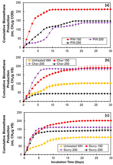 The cumulative biomethane generation of untreated WH and each of the WH HTC products; process waters, hydrochars, and slurries is displayed in Figure 4a–c, with the digestion kinetics described in Table 6.