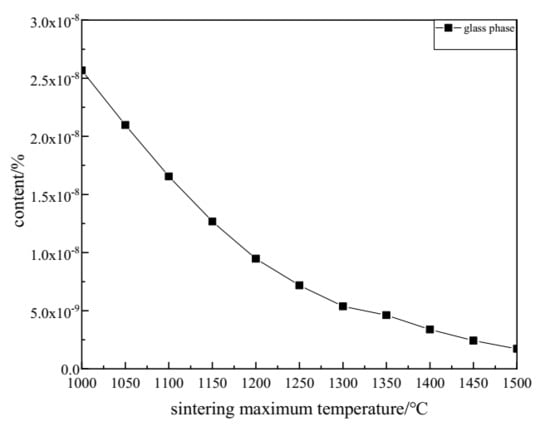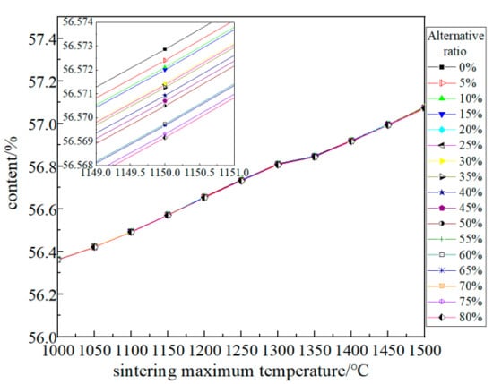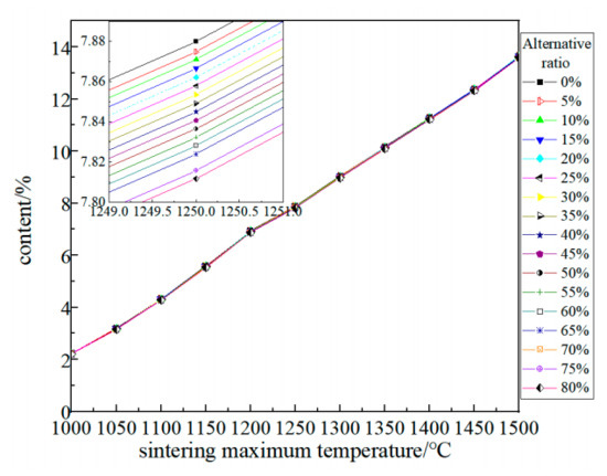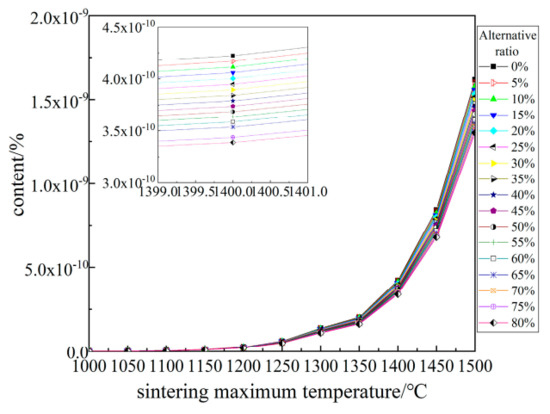 The lower the sulfur content, the better quality of sinter ore. As shown in Figure 4, the S content of the sinter increases as the sintering maximum temperature increases. As the substitution ratio of the straw charcoal increases, the S content decreases. When the sintering maximum temperature is 1500 °C and the solid fuel used is 100% coke breeze, the content of S in the sinter ore is 1.6 × 10−9%, which is much lower than that of the high-qualitied sinter ore’s limit. Although the content of S rises rapidly with the increase of the sintering maximum temperature, its influence can be neglected in view of the fact that the amount of change is extremely small.