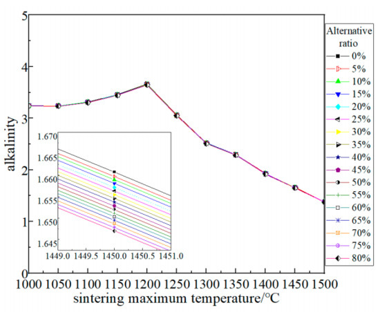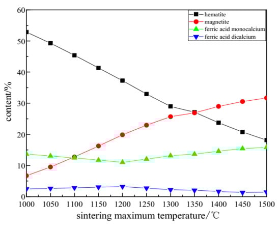 As shown in Figure 2, the basicity first rises and then decreases with the increase of the maximum temperature in the sinter process. At the sintering maximum temperature of 1200 °C, the basicity is the largest, up to 3.7. When the sintering maximum temperature is about 1440 °C, the sinter basicity drops to 1.7, which is commonly the bottom line of the high-quality sinter’s basicity standard.