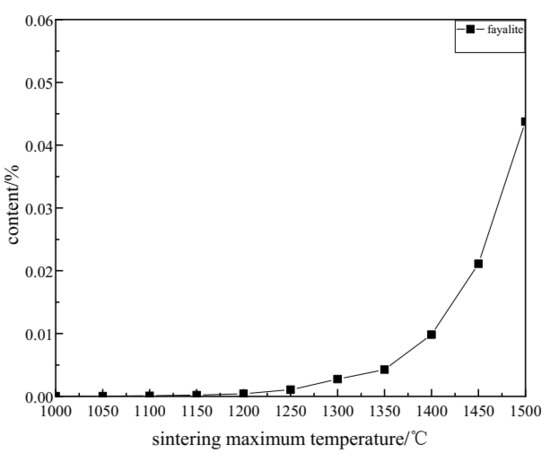 The compositions of the metallurgical properties with the sintering maximum temperature are shown in Figure 5, Figure 6 and Figure 7. According to the analysis of the graphs, although the content of fayalite increases, a higher content of ferric acid–calcium, lower content of ferric acid–dicalcium, and suitable content of hematite and magnetite can be obtained when the maximum temperature of sintering increases. For the glass phase having the worst strength, its reducibility is also minimized.