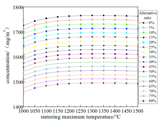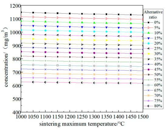 The straw charcoal is used instead of the coke breeze for sinter, and the obtained SO2 concentration changes with the substitution ratio and the sintering maximum temperature are shown in Figure 8. The concentration of SO2 is related to the sintering maximum temperature and the substitution ratio. It decreases with the increase of the substitution ratios of straw charcoal and remains almost unchanged with the increase of the sintering maximum temperature.